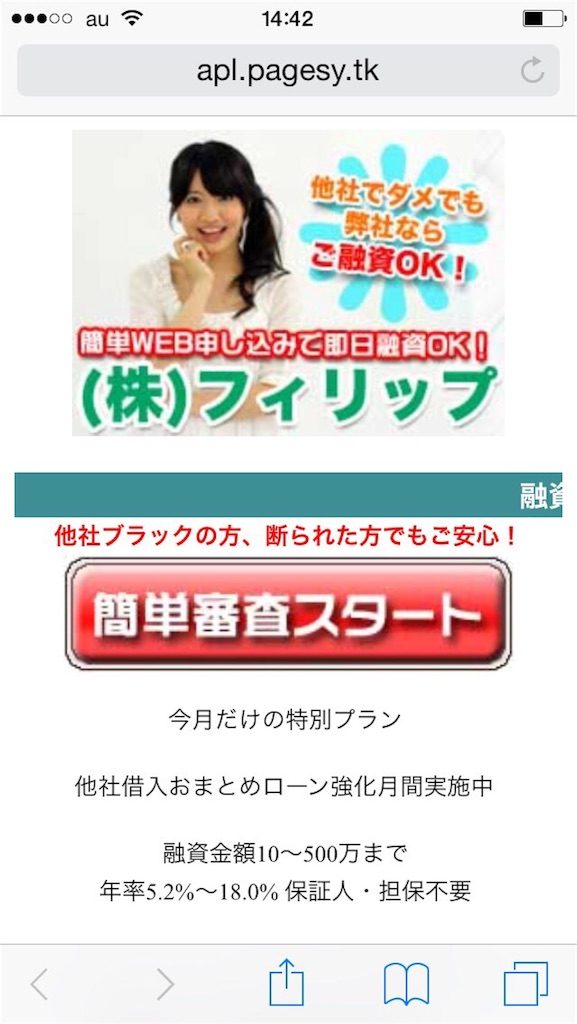 簡単審査、500万円まで融資可能、保証人担保不要、年率5.2%〜18%で融資可能など、甘い言葉がたくさん並んでいますが、ここに書かれている事は全てデタラメだと思ってください。