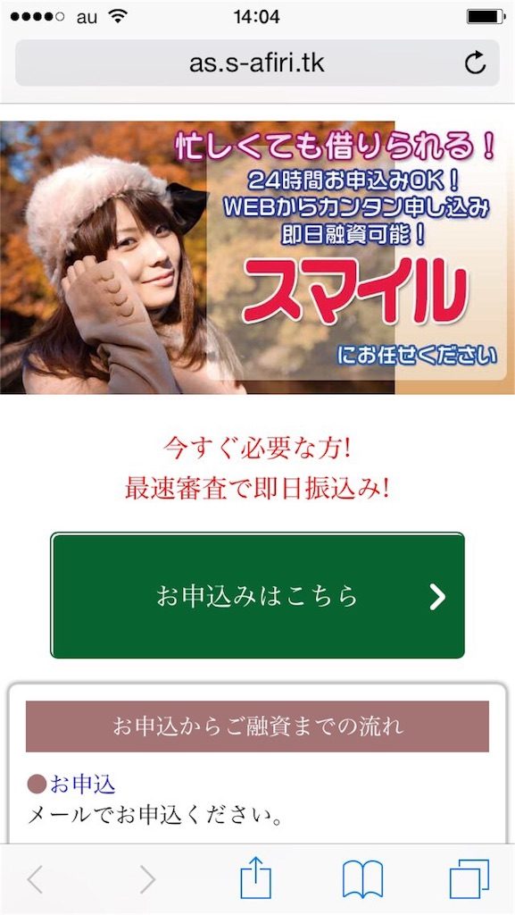 しかしこのスマホサイトは、そのスマイルの情報を全て丸パクリして、いかにも正規の金融業者であるかのように見せかけて営業している悪質なヤミ金です。