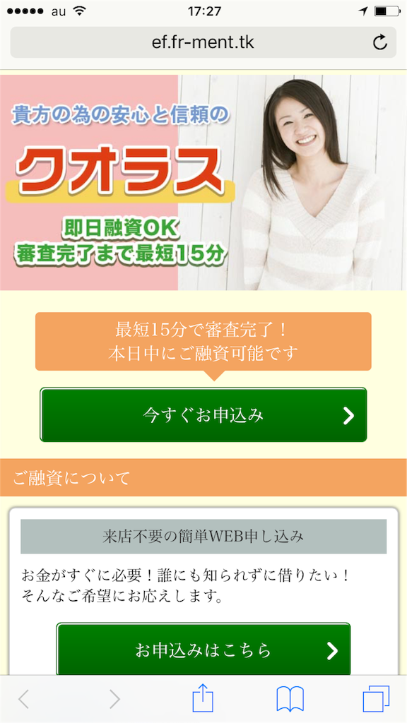 奇麗なスマホサイトが用意されており、いかにも正規の金融業者のように見えますが、完全な闇金なので騙されないように注意して下さい。
