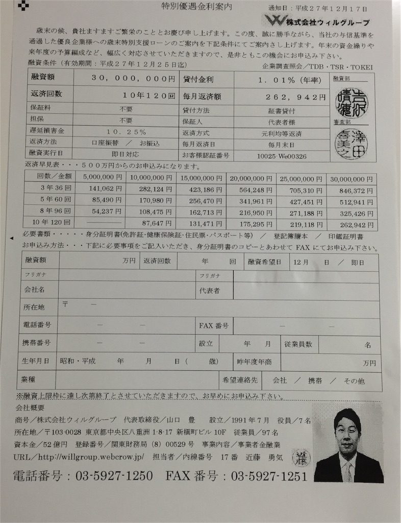 特別優遇金利案内と言うFAXを送ってくる「ウィルグループ」は、保証金詐欺を狙っている会社です。