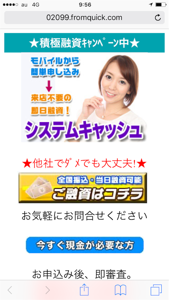 積極融資キャンペーン中、来店不要の即日融資、他社でダメでも融資可能など、甘い言葉がたくさん書いてありますが、ここに書いてあることが全て嘘だと思ってください。