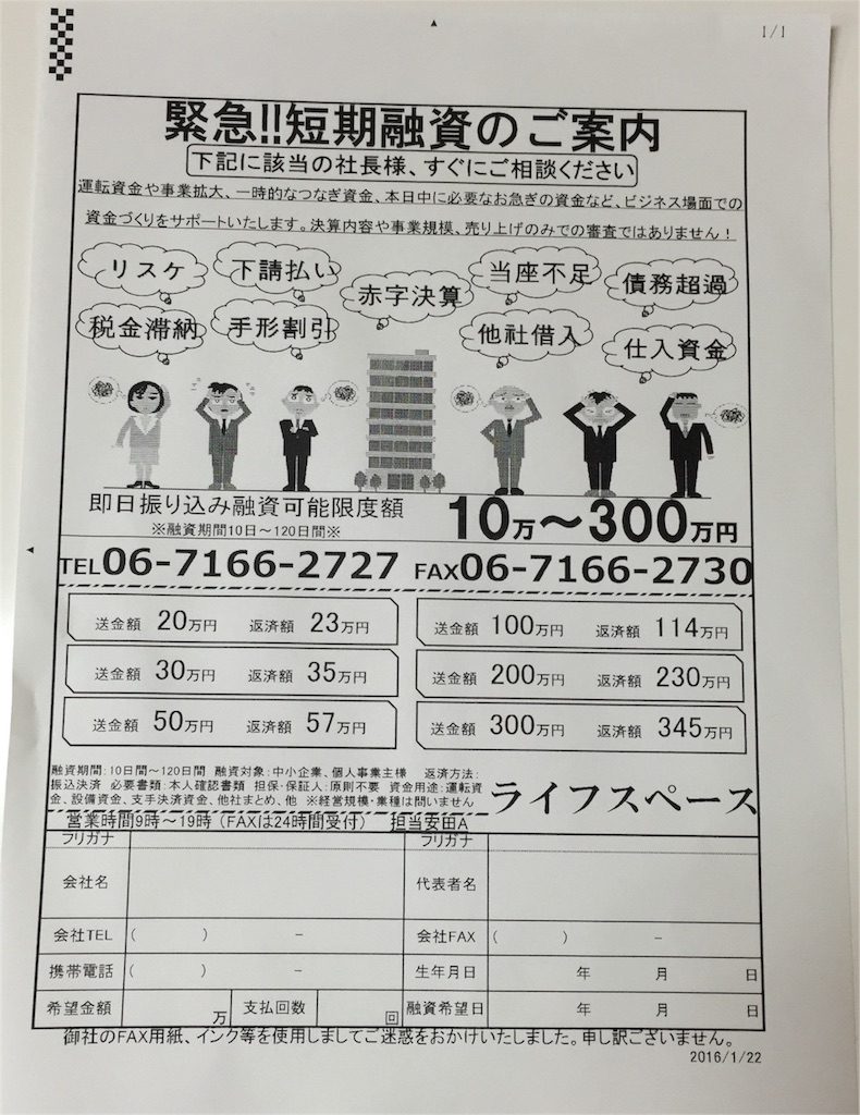 「緊急!!短期融資のご案内」というFAXが届きました。