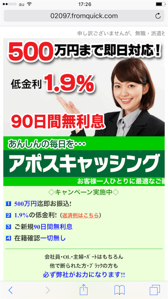 500万円まで即日対応、低金利1.9%、90日間無利息など甘い言葉がたくさん書いてありますが、ここに書いてあることは全てデタラメです。