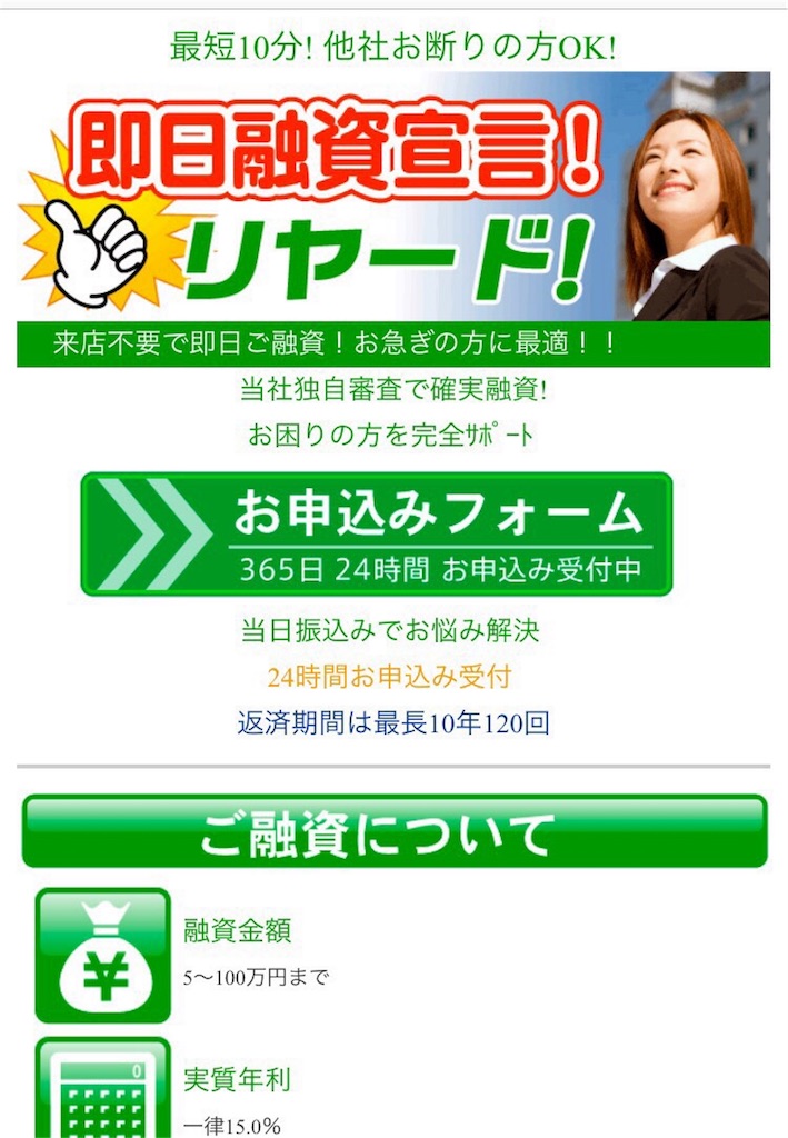 きれいなスマホサイトを用意して、いかにも正規の金融業者のように装っていますが、完全に闇金なので騙されないように注意してください。