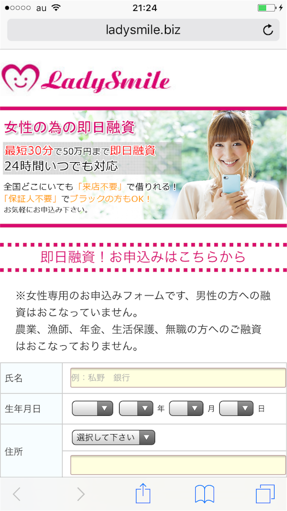 綺麗なスマホサイトを作って、女性の為の即日融資と言っていますが、完全に闇金です、騙されないように注意して下さい。