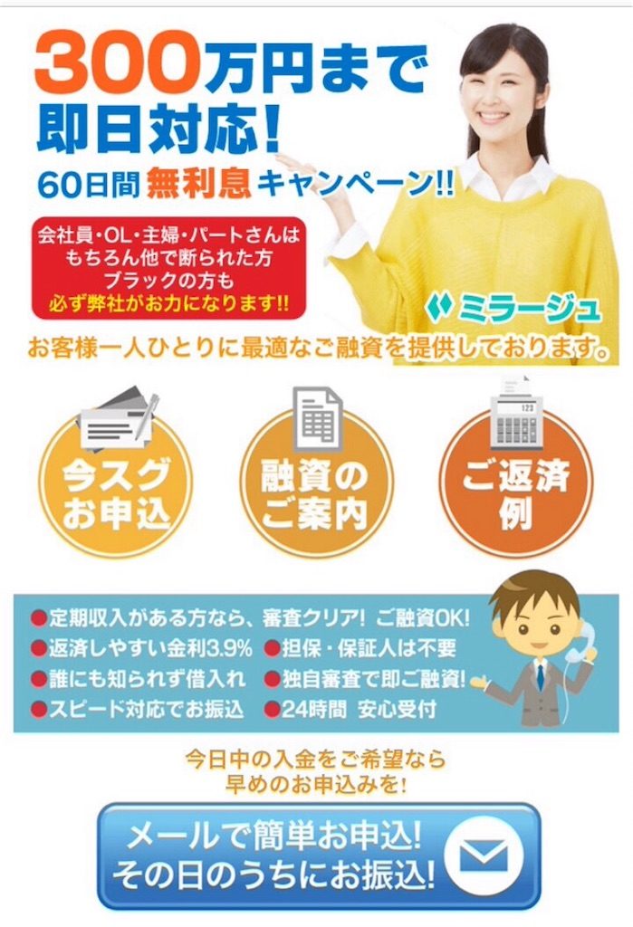 300万円まで即日対応の「ミラージュ」は闇金です。