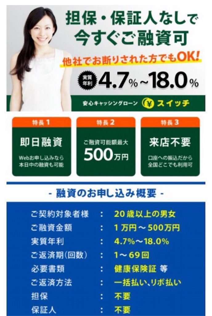実質年率4.7%〜18.0%、他社でお断りされた方でもOK、担保・保証人無しで今すぐ有し可、最大500万円まで融資可能など、甘い事ばかり書いていますが、ここに書いてある事は全てデタラメです。