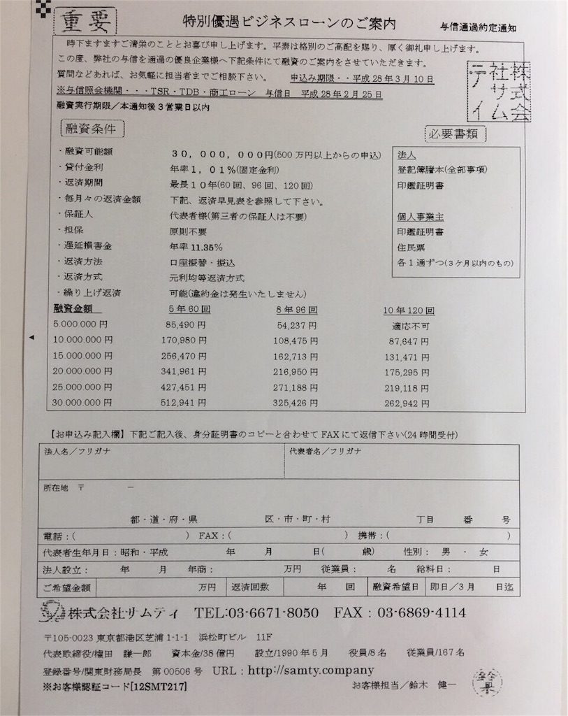 「株式会社サムティ」と言う会社から、特別優遇ビジネスローンのご案内と言うFAXが届きました。