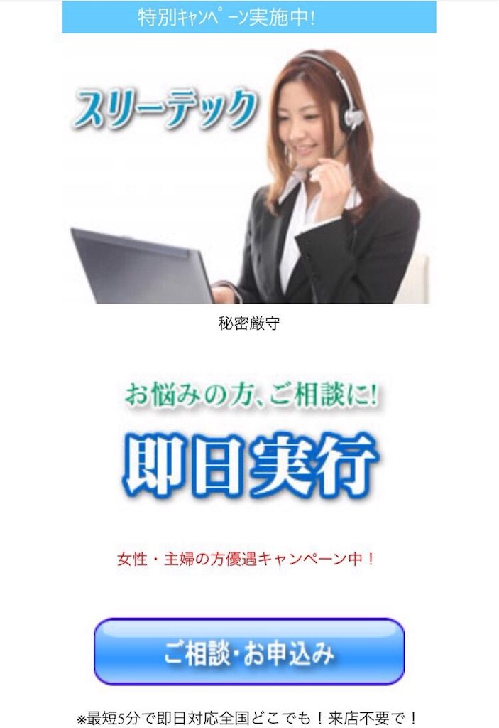 秘密厳守、女性、主婦の方優遇キャンペーン中、即日実行など、良いことばかり書いていますがここに書いてあることが全てデタラメです。