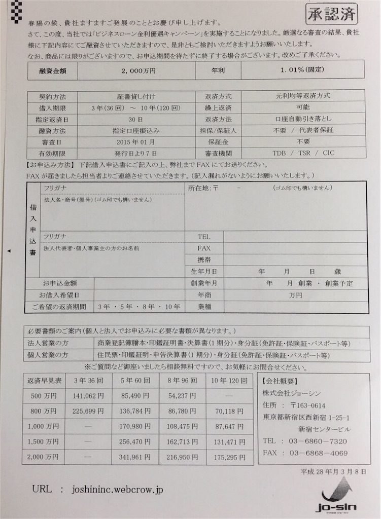 「株式会社ジョーシン」という会社から、ビジネスローン金利優遇キャンペーン審査通過と言うFAXが届きました。