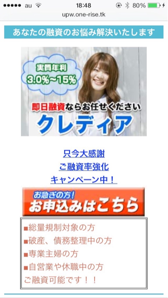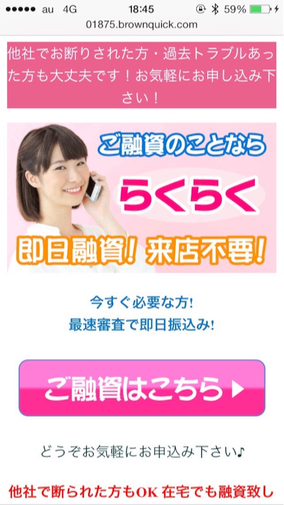 最高ご融資金額500万円まで、10万円から今すぐにご用意します、低金利3.9%〜など良いことばかり書いていますがここに書いてあることが全てデタラメです。