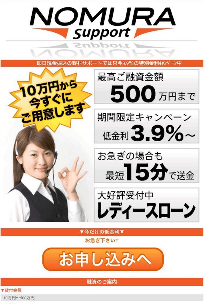 10万円から今すぐに融資可能な「NOMURA Support(野村サポート)」は闇金です。