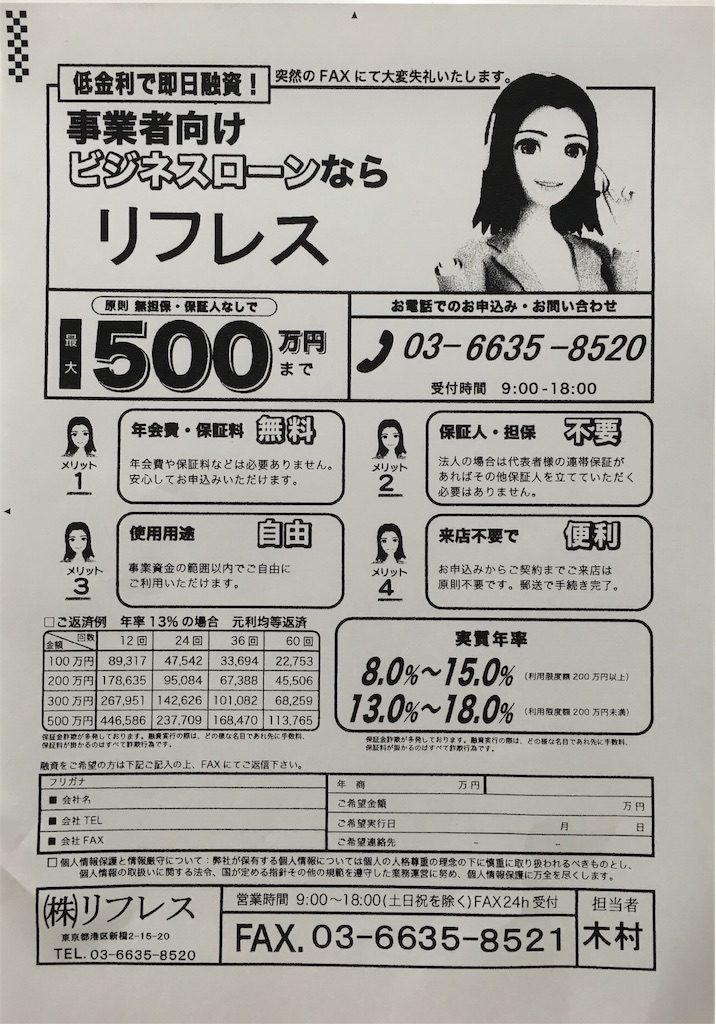 ビジネローンの「㈱リフレス」という会社からFAXが届きました。