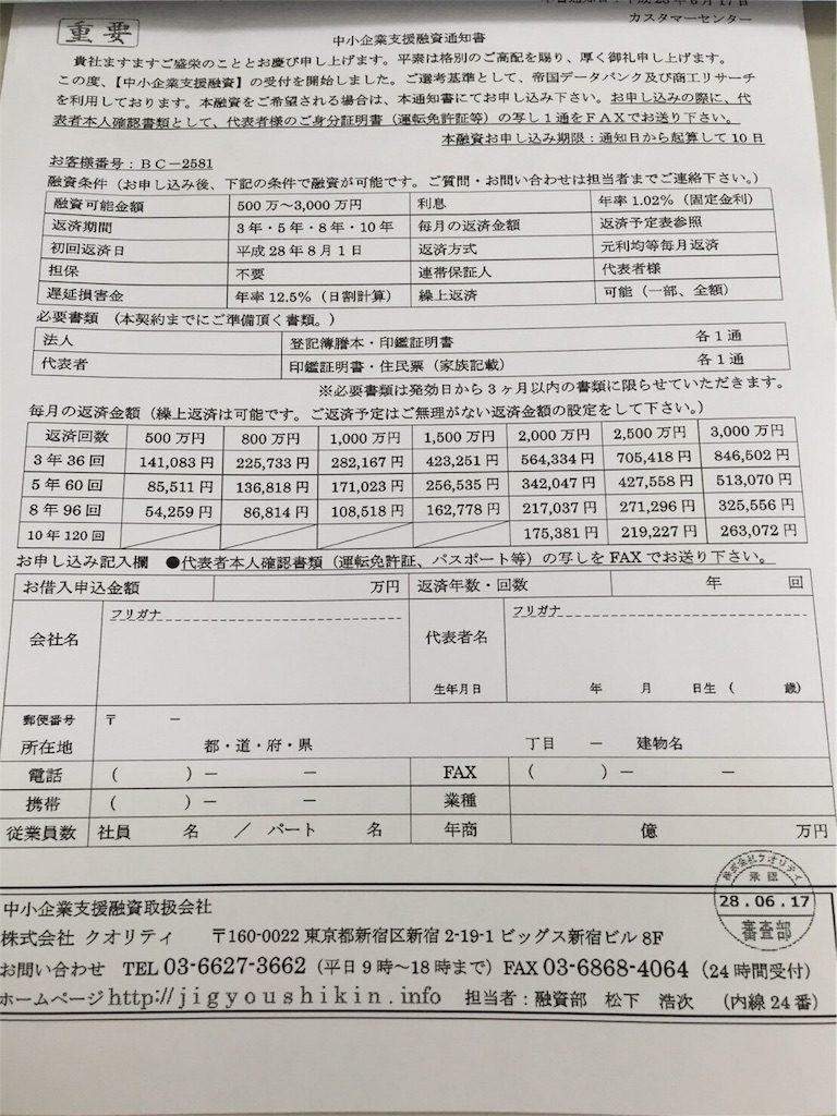 「株式会社クオリティ」から、中小企業支援融資通知書と言うFAXが届きました。