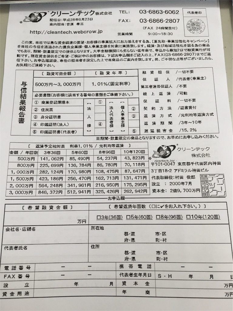 「クリーンテック株式会社」という会社から、与信結果報告書のご案内というFAXが届きました。
