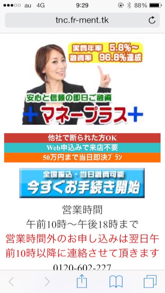 他社で借入困難な方のご融資率93%、職種不問・手数料不要・即日振込、実質年率9.97%〜15.25%、など、良いことばかり書いていますがここに書いてあることが全て嘘です。
