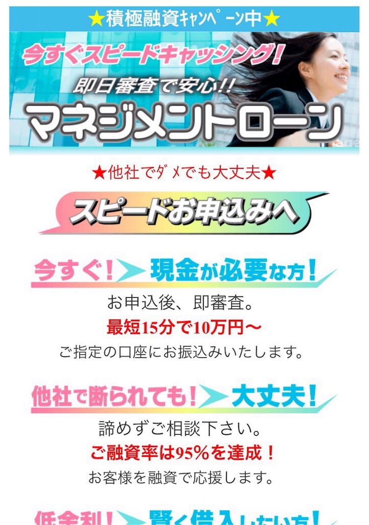 来店不要!最短5分で受付完了!他社でお断りされた方でもOKなど、いいことばかり書いていますがここに書いてやる事は全てデタラメです。
