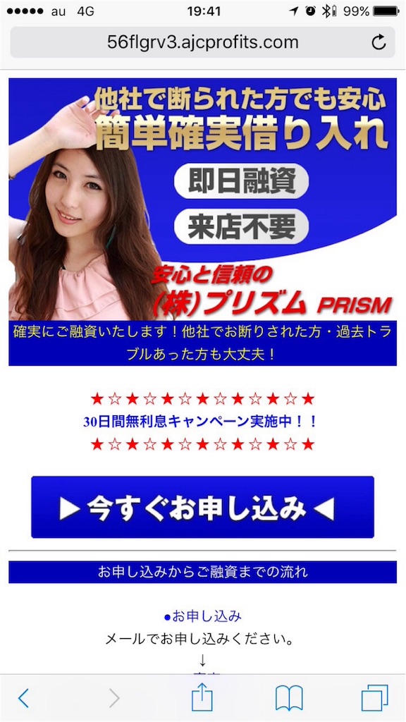 いかにも正規の金融業者のように装っていますが、完全に闇金なので申し込みしないようにしてください。