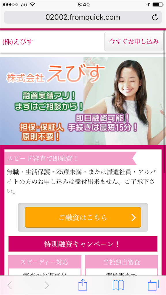 きれいなスマホサイトに見えますが、中身はペラペラの申込みだけさせようとする、完全な闇金なので騙されないように注意してください。