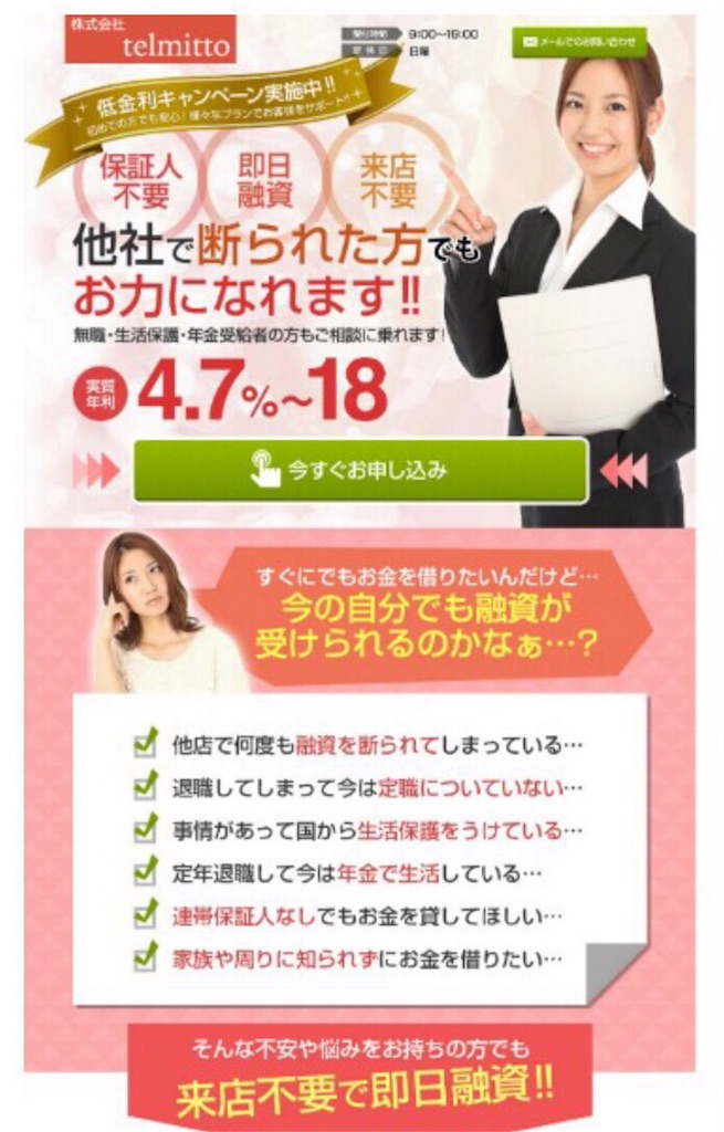 お申込後、即審査、ご融資率は95%を達成、業界No1低金利5.8%〜、などいい事ばかり書いていますが、ここに書いてある事は全てデタラメです。