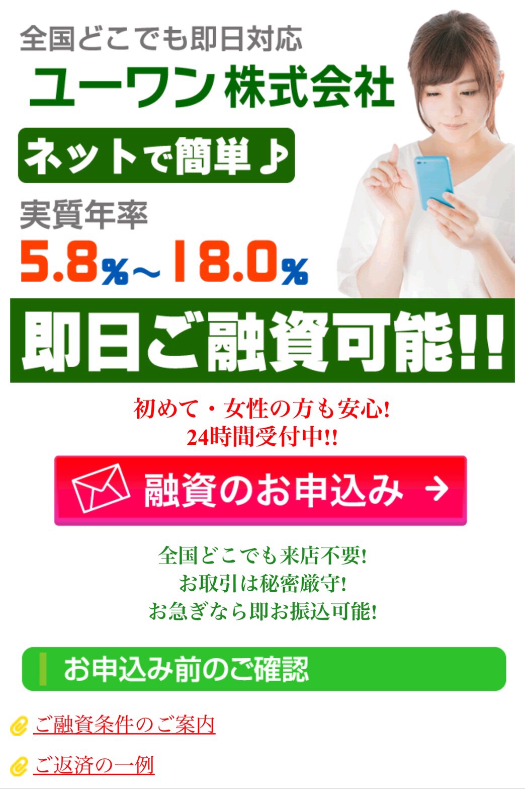 1週間無利息、本日中に振込OK、秘密厳守で幅広く対応など、いい事ばかり書いていますが、ここに書いてある事は全てデタラメです。