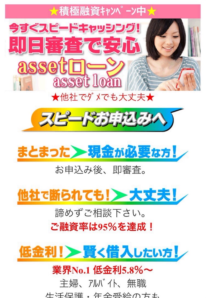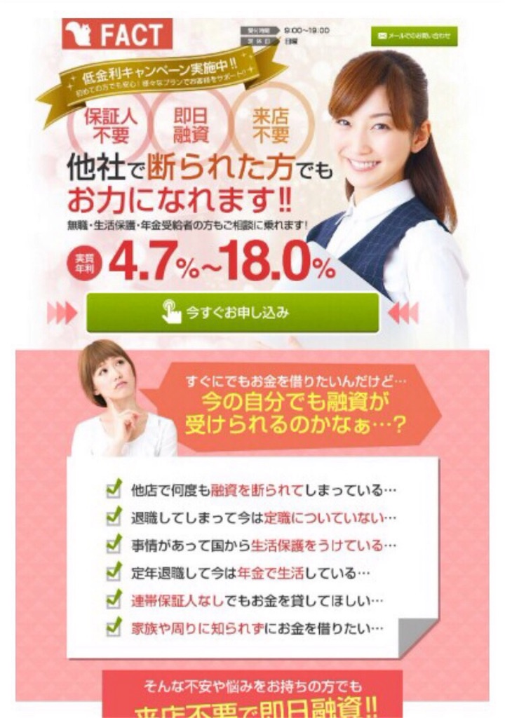 他社とは違います、全国対応可能!来店不要の即日!幅広い対応が可能ですなど、良いことばかり書いていますがここに書いてあることが全てデタラメです。