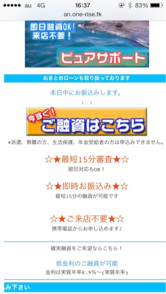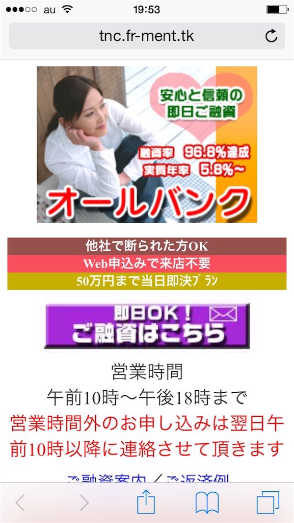 全国どこでも即日有し可能!即日融資、来店不要、独自審査、24時間対応、最大50万迄など、いい事ばかり書いていますが、ここに書いてある事は全て嘘です。