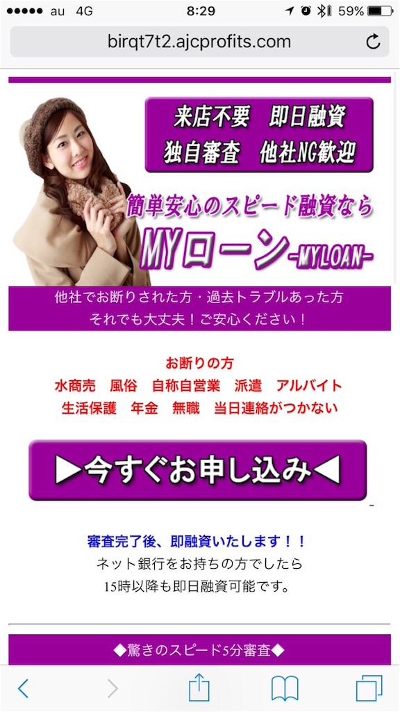 融資実態が無く、申し込みしてしまうと銀行口座やスマートフォンを騙し取られる可能性が高い危険なサイトです。