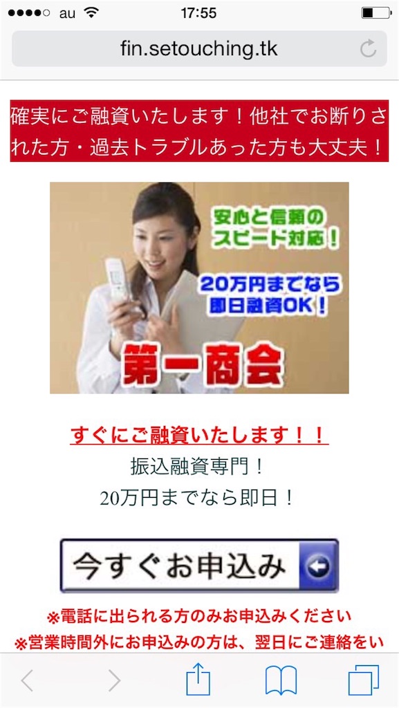 融資実態が無く、申し込みしてしまうと銀行口座やスマートフォンを騙し取られる可能性が高い危険なサイトです。