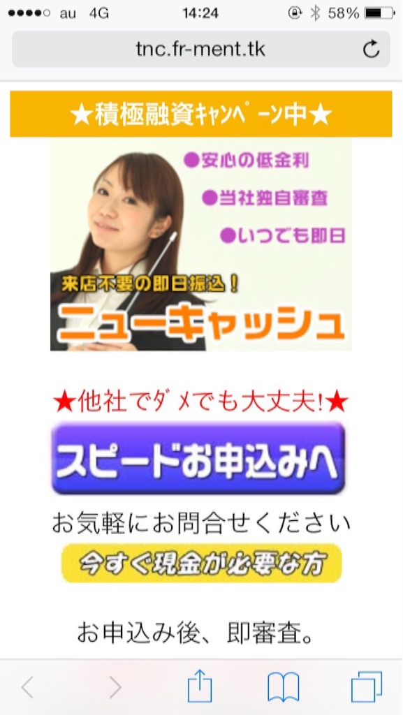 ネットからの申し込み有難うございます。初回融資枠が5万円でした。是非ご利用がありましたら気軽にご連絡を下さい。㈱オリオン担当高木と闇金の勧誘メールです。