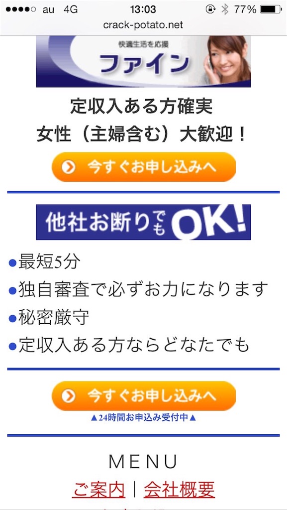 「融資枠の上限100万円!最低金利15%!!お支払い回数はご相談ください、詳細は電話対応になります。」