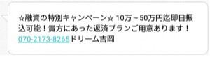 ★融資の特別キャンペーン★10万〜50万円迄即日振込可能!貴方にあった返済プランご用意あります!070-2173-8265ドリーム吉岡と書いていますが、闇金の勧誘メールです。