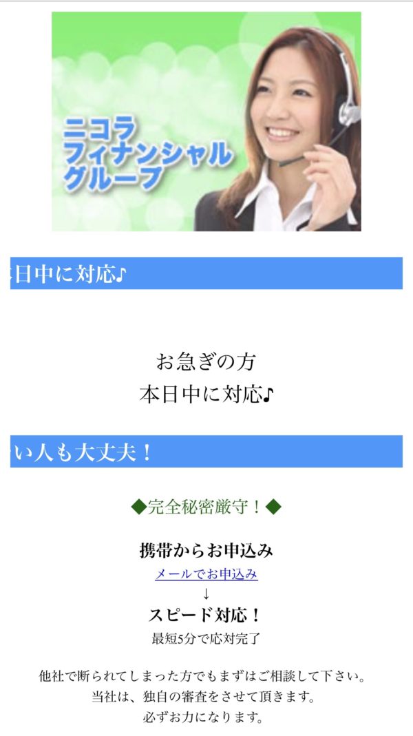 金融登録番号も住所も記載されていない完全な闇金です、最近はやりの1ページだけで作り込まれた闇金サイトです。