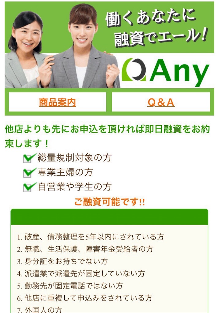 他社で断られた方でもお力になれます!と審査が甘く、誰にでも融資をしてくれる消費者金融のように装っていますが、このような安易にお金を借りられるような誘い文句は、貸金業法で禁止されています。