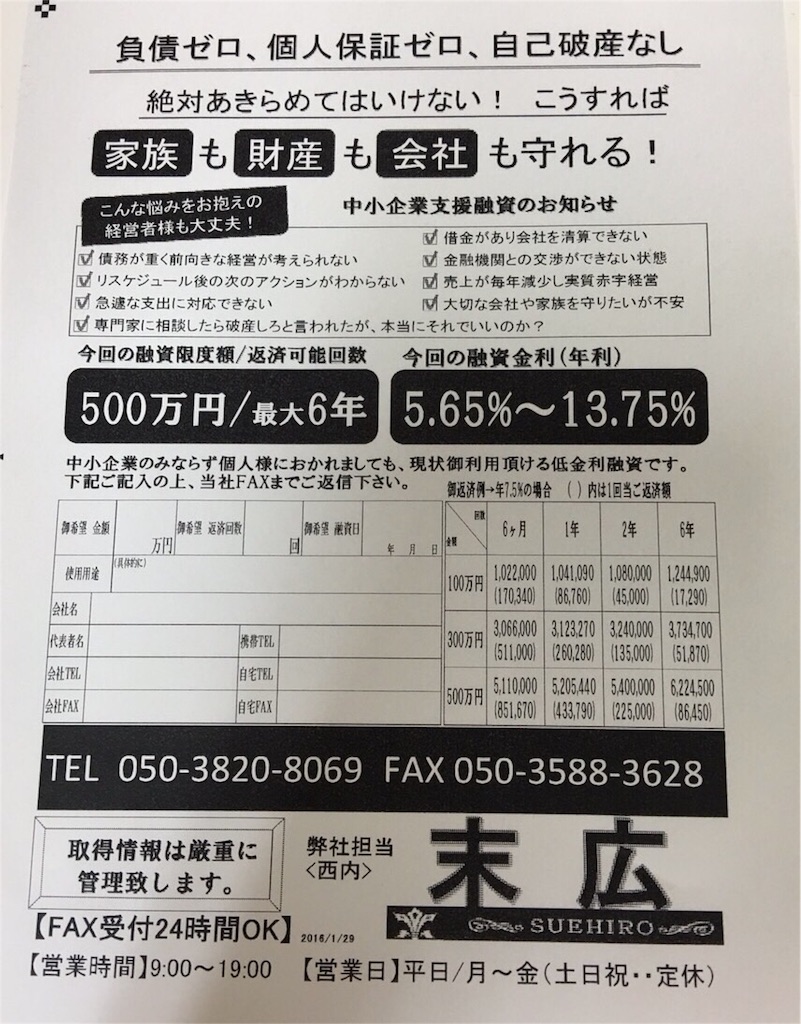 連絡先が一切記載されていないので、騙されたと気づいても連絡を取る方法がありません、危険な闇金です、こんな金融業者は世の中に存在しないので注意してください。