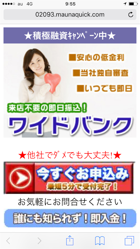最短30分全国どこでも即日融資可。誰にも知られずWEB完結来店不要!どなたでも融資可保証人不要などの文言で、審査が甘く、申し込みすれば、誰にでも融資をしてくれるというような、簡単にお金を借りられるような誘い文句で、騙して申し込みをさせようとしています。