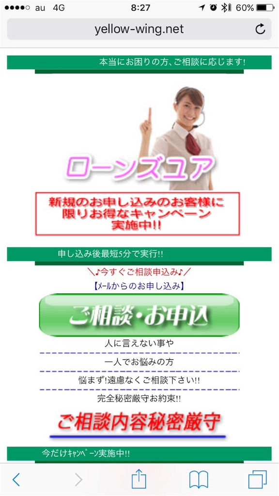 最短5分で実行!お得なキャンペーン実施中、ご相談内容秘密厳守で新規契約や失業・入院時救済、1人でも多くの方へゆとりある生活へサポートしますと書いていますが嘘ですよ。