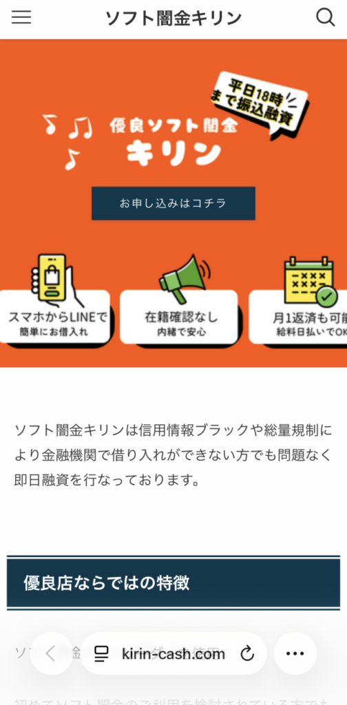 初めての方でも安心!ソフト闇金キリンは信用情報ブラックや総量規制により金融機関で借り入れができない方でも問題なく即日融資を行なっております。とサイトに書いている