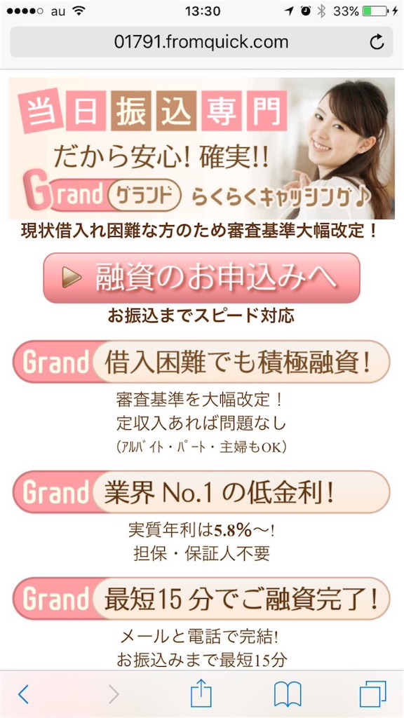 綺麗に作り込まれたスマホサイトを見ると、正規金融業者の貸金サイトに見えますが、貸金業登録を行っていない無登録の違法サイトです。
